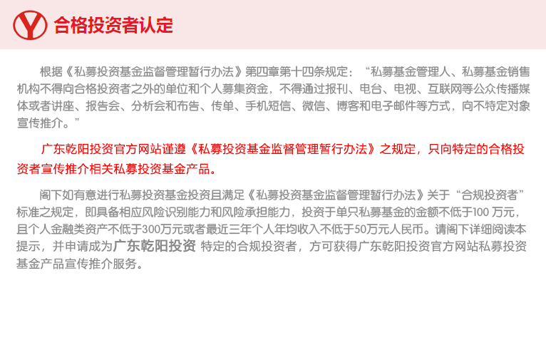 廣東乾陽投資管理有限公司于2011年5月在廣州成立,注冊資本1000萬元,是一家在中國證券投資基金業(yè)協(xié)會(huì)登記備案的私募投資基金。 公司秉持“客戶利益,審慎經(jīng)營,規(guī)范誠信,志在久遠(yuǎn)”的經(jīng)營理念,踐行“公司的內(nèi)在價(jià)值決定其投資價(jià)值”的核心投資理念,悉心打造公司的核心競爭力——深入嚴(yán)謹(jǐn)?shù)耐堆蟹治瞿芰Γ∈亻L期、集中的投資策略并結(jié)合基于估值及市場趨勢的選時(shí)策略,形成了乾陽投資成熟穩(wěn)健的投資風(fēng)格。 公司以產(chǎn)業(yè)資本的視角深度挖掘資本市場中的優(yōu)秀企業(yè),通過建立嚴(yán)謹(jǐn)?shù)纳鲜泄菊{(diào)研制度,嚴(yán)肅的投資決策流程和嚴(yán)格的風(fēng)險(xiǎn)管控制度,力圖實(shí)現(xiàn)高回報(bào)與確定性的完美統(tǒng)一,幫助客戶分享企業(yè)持續(xù)穩(wěn)健成長帶來的... |